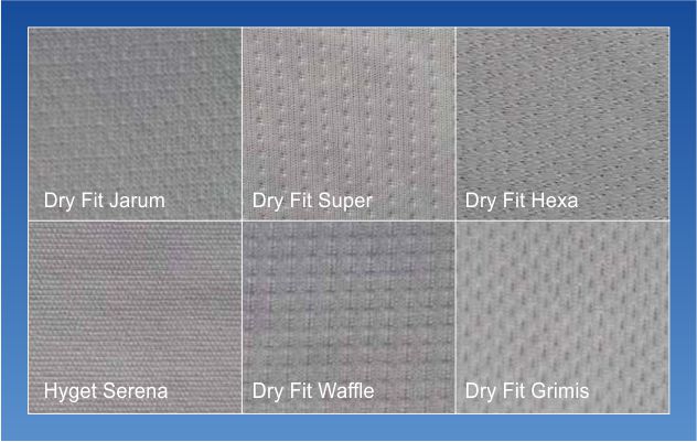 Bahan yang kami pakai adalah bahan pilihan berkualitas, seperti: Dry Fit Benzema, Dry Fit Jarum, Dry Fit Super, Dry Fit Hexagonal, Wafle/ Wafer, Hyger, Serena, dll.